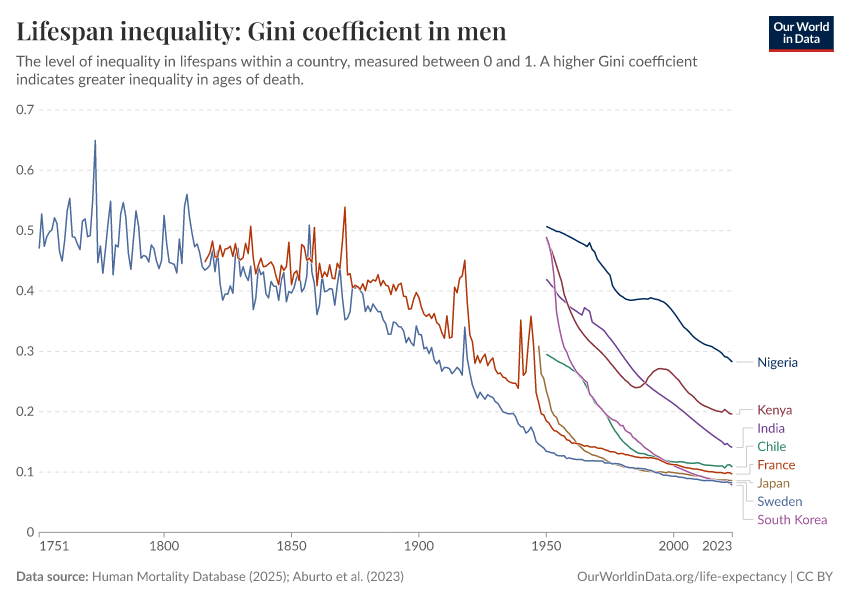 Human Mortality Database (2025); Aburto et al. (2023) – with major processing by Our World in Data. “Lifespan inequality: Gini coefficient in men” [dataset]. Human Mortality Database, “Human Mortality Database”; United Nations, “World Population Prospects” [original data]. Retrieved January 8, 2026 from https://multi-dim-redirects-index.owid.pages.dev/grapher/gini-coefficient-of-lifespan-inequality-in-males