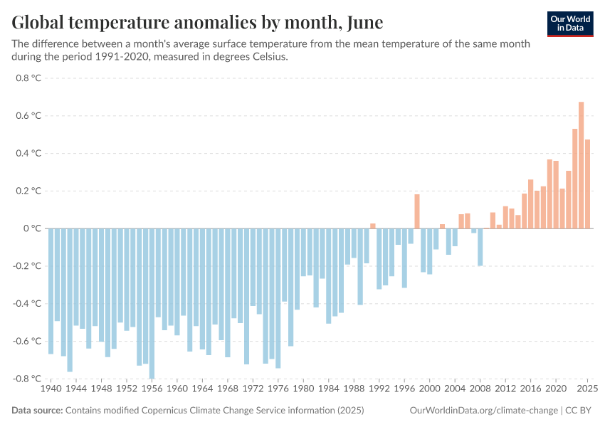 Contains modified Copernicus Climate Change Service information (2025) – with major processing by Our World in Data. “Global temperature anomalies by month” [dataset]. Contains modified Copernicus Climate Change Service information, “ERA5 monthly averaged data on single levels from 1940 to present 2” [original data]. Retrieved January 8, 2026 from https://multi-dim-redirects-index.owid.pages.dev/grapher/global-temperature-anomalies-by-month