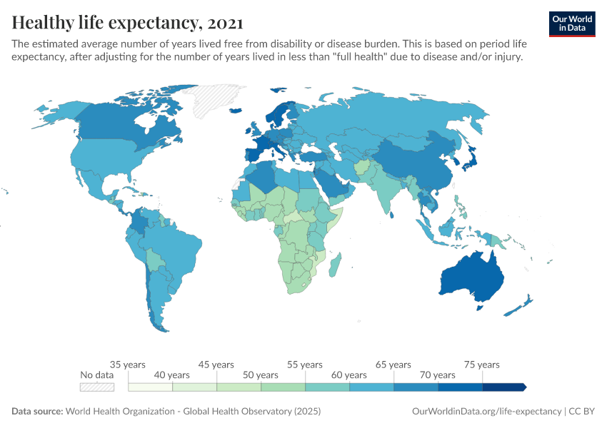 World Health Organization - Global Health Observatory (2025) – processed by Our World in Data. “Healthy life expectancy” [dataset]. World Health Organization, “Global Health Observatory” [original data]. Retrieved January 8, 2026 from https://multi-dim-redirects-index.owid.pages.dev/grapher/healthy-life-expectancy-at-birth