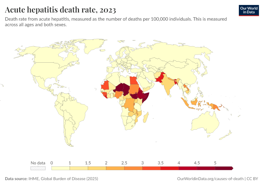 IHME, Global Burden of Disease (2024) – with minor processing by Our World in Data. “Acute hepatitis death rate” [dataset]. IHME, Global Burden of Disease, “Global Burden of Disease - Deaths and DALYs” [original data]. Retrieved January 8, 2026 from https://multi-dim-redirects-index.owid.pages.dev/grapher/hepatitis-death-rate