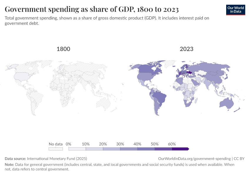 International Monetary Fund (2025) – with minor processing by Our World in Data. “Government spending as share of GDP” [dataset]. International Monetary Fund, “Public Finances in Modern History” [original data]. Retrieved January 8, 2026 from https://multi-dim-redirects-index.owid.pages.dev/grapher/historical-gov-spending-gdp