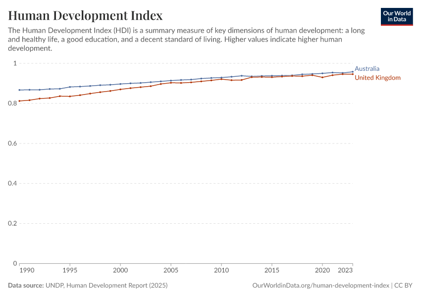 UNDP, Human Development Report (2025) – with minor processing by Our World in Data. “Human Development Index – UNDP” [dataset]. UNDP, Human Development Report, “Human Development Report” [original data]. Retrieved January 8, 2026 from https://multi-dim-redirects-index.owid.pages.dev/grapher/human-development-index