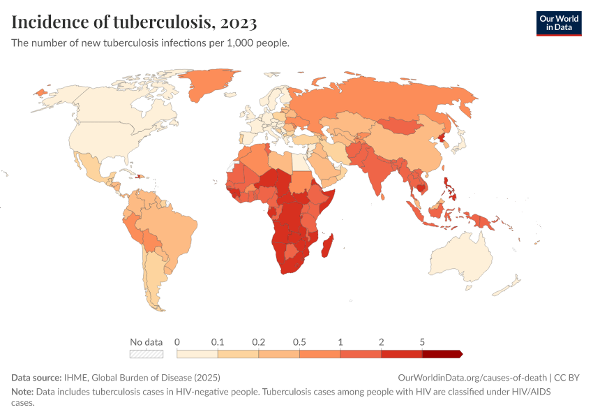“Data Page: Incidence of tuberculosis”, part of the following publication: Esteban Ortiz-Ospina and Max Roser (2016) - “Global Health”. Data adapted from IHME, Global Burden of Disease. Retrieved from https://multi-dim-redirects-index.owid.pages.dev/grapher/incidence-of-tuberculosis [online resource]How to cite this data