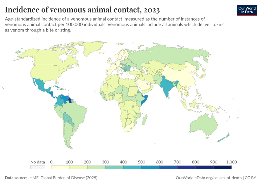 “Data Page: Incidence of venomous animal contact”, part of the following publication: Esteban Ortiz-Ospina and Max Roser (2016) - “Global Health”. Data adapted from IHME, Global Burden of Disease. Retrieved from https://multi-dim-redirects-index.owid.pages.dev/grapher/incidence-of-venomous-animal-contact [online resource]How to cite this data