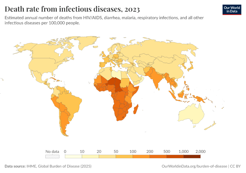 IHME, Global Burden of Disease (2024) – with minor processing by Our World in Data. “Death rate from infectious diseases” [dataset]. IHME, Global Burden of Disease, “Global Burden of Disease - Deaths and DALYs” [original data]. Retrieved January 8, 2026 from https://multi-dim-redirects-index.owid.pages.dev/grapher/infectious-disease-death-rates-gbd