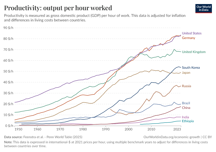 Feenstra et al. - Penn World Table (2025) – with major processing by Our World in Data. “Productivity: output per hour worked – Penn World Table – In constant international-$” [dataset]. Feenstra et al., “Penn World Table 11.0” [original data]. Retrieved January 8, 2026 from https://multi-dim-redirects-index.owid.pages.dev/grapher/labor-productivity-per-hour-pennworldtable