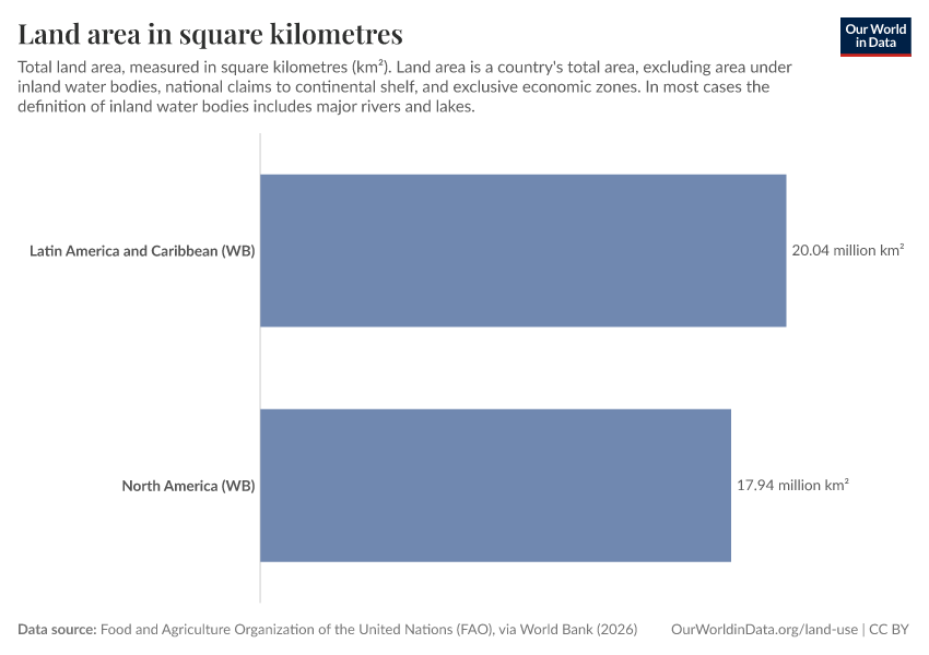 Food and Agriculture Organization of the United Nations (FAO), via World Bank (2025) – processed by Our World in Data. “Land area in square kilometres” [dataset]. Food and Agriculture Organization of the United Nations (FAO), via World Bank, “World Development Indicators 122” [original data]. Retrieved January 8, 2026 from https://multi-dim-redirects-index.owid.pages.dev/grapher/land-area-km