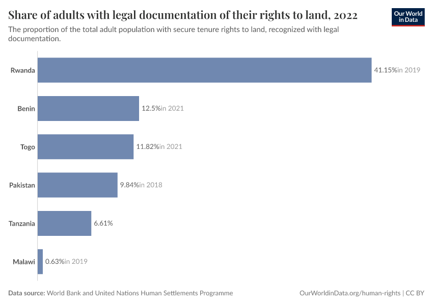 World Bank and United Nations Human Settlements Programme – processed by Our World in Data. “Share of adults with legal documentation of their rights to land” [dataset]. World Bank and United Nations Human Settlements Programme, “Data from multiple sources” [original data]. Retrieved January 8, 2026 from https://multi-dim-redirects-index.owid.pages.dev/grapher/legally-recognized-rights-to-land