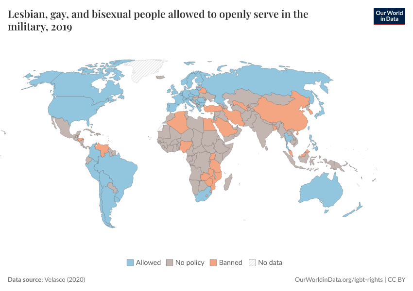 “Data Page: Lesbian, gay, and bisexual people allowed to openly serve in the military”, part of the following publication: Bastian Herre and Pablo Arriagada (2023) - “LGBT+ Rights”. Data adapted from Velasco. Retrieved from https://multi-dim-redirects-index.owid.pages.dev/grapher/lgb-military-velasco [online resource]How to cite this data