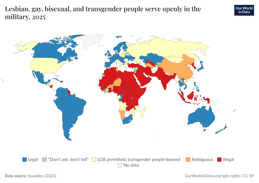 “Data Page: Lesbian, gay, bisexual, and transgender people serve openly in the military”, part of the following publication: Bastian Herre and Pablo Arriagada (2023) - “LGBT+ Rights”. Data adapted from Equaldex. Retrieved from https://multi-dim-redirects-index.owid.pages.dev/grapher/lgbt-military-equaldex [online resource]How to cite this data