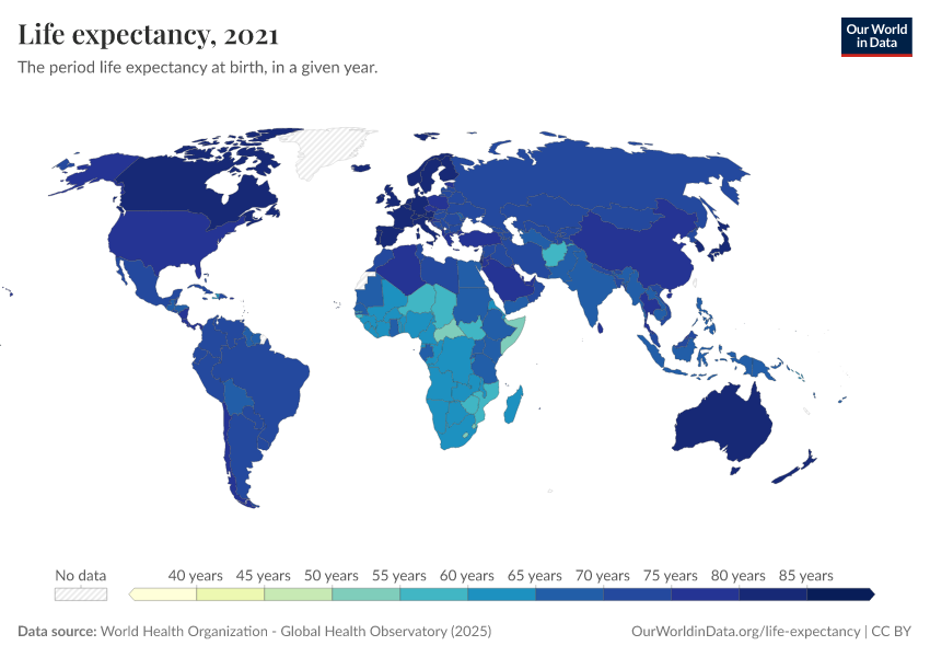 World Health Organization - Global Health Observatory (2025) – processed by Our World in Data. “Life expectancy” [dataset]. World Health Organization, “Global Health Observatory” [original data]. Retrieved January 8, 2026 from https://multi-dim-redirects-index.owid.pages.dev/grapher/life-expectancy-at-birth-who-gho