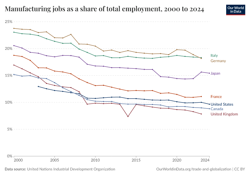 “Data Page: Manufacturing jobs as a share of total employment”. Our World in Data (2026). Data adapted from United Nations Industrial Development Organization. Retrieved from https://multi-dim-redirects-index.owid.pages.dev/grapher/manufacturing-share-of-total-employment [online resource]How to cite this data