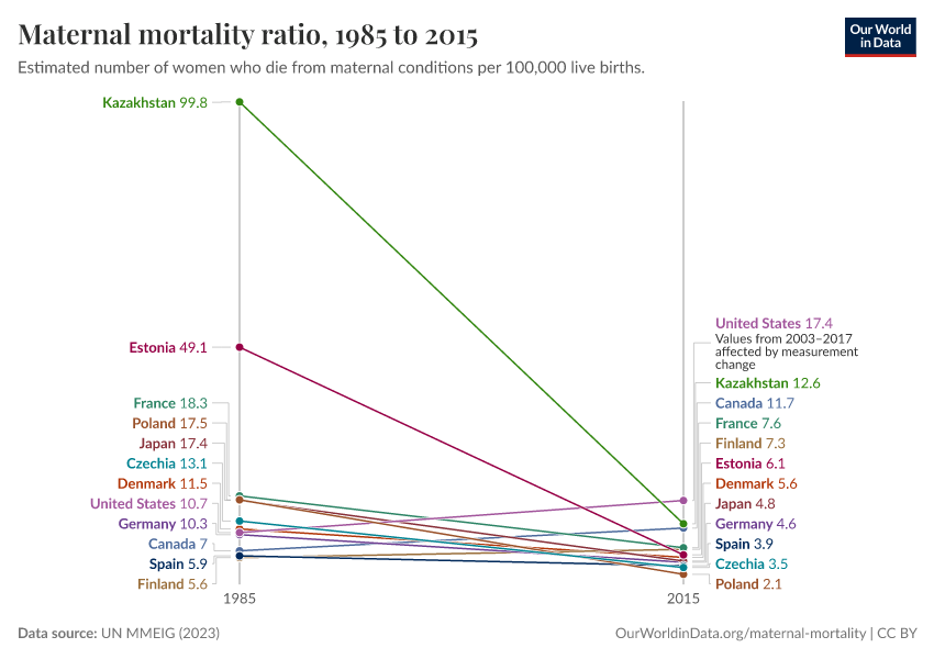 UN MMEIG (2023) – processed by Our World in Data. “Maternal mortality ratio” [dataset]. UN MMEIG (WHO, UNICEF, UNFPA, World Bank Group and UNDESA/ Population Division), “Trends in maternal mortality 2020” [original data]. Retrieved January 8, 2026 from https://multi-dim-redirects-index.owid.pages.dev/grapher/maternal-mortality-slope-chart