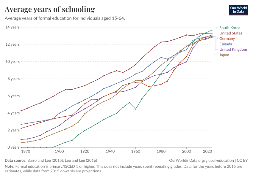 Barro and Lee (2015); Lee and Lee (2016) – with major processing by Our World in Data. “Average years of schooling” [dataset]. Barro and Lee, “Projections of Educational Attainment”; Lee and Lee, “Human Capital in the Long Run” [original data]. Retrieved January 8, 2026 from https://multi-dim-redirects-index.owid.pages.dev/grapher/mean-years-of-schooling-long-run