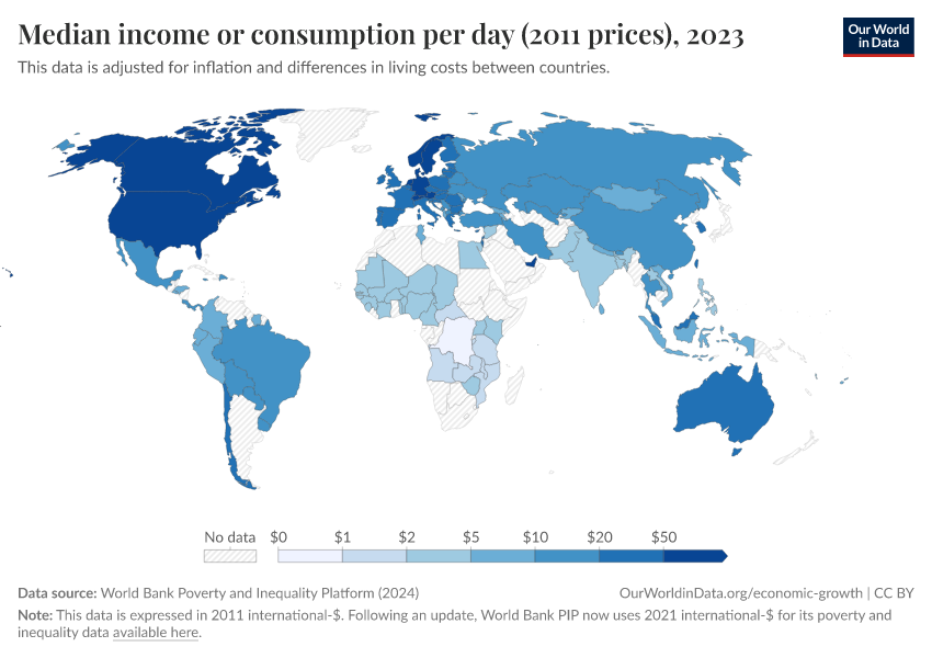 World Bank Poverty and Inequality Platform (2024) – with major processing by Our World in Data. “Median income or consumption per day (2011 prices) – World Bank” [dataset]. World Bank Poverty and Inequality Platform, “World Bank Poverty and Inequality Platform (PIP) 20240627_2017, 20240627_2011” [original data]. Retrieved January 8, 2026 from https://multi-dim-redirects-index.owid.pages.dev/grapher/median-income-or-consumption-per-day-2011-prices