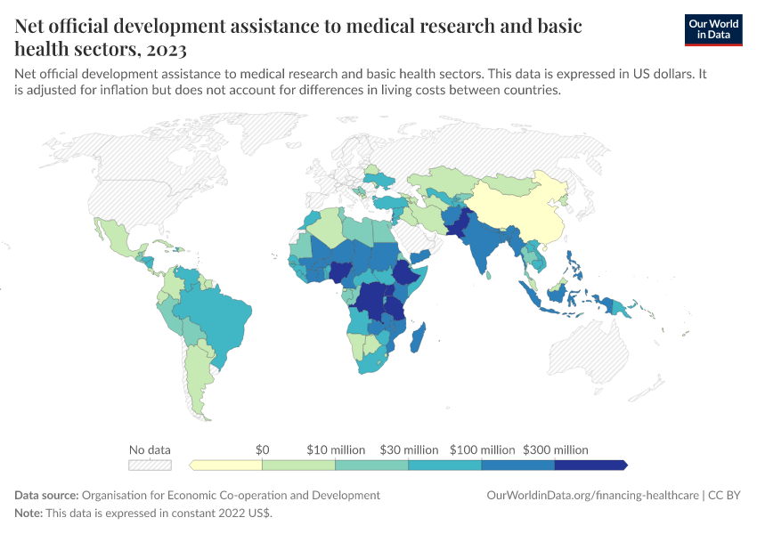 “Data Page: Net official development assistance to medical research and basic health sectors”. Our World in Data (2026). Data adapted from Organisation for Economic Co-operation and Development. Retrieved from https://multi-dim-redirects-index.owid.pages.dev/grapher/net-oda-to-medical-research [online resource]How to cite this data