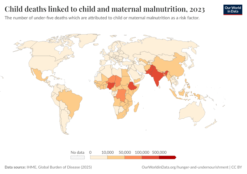 IHME, Global Burden of Disease (2024) – with minor processing by Our World in Data. “Child deaths linked to child and maternal malnutrition” [dataset]. IHME, Global Burden of Disease, “Global Burden of Disease - Risk Factors” [original data]. Retrieved January 8, 2026 from https://multi-dim-redirects-index.owid.pages.dev/grapher/number-child-deaths-malnutrition