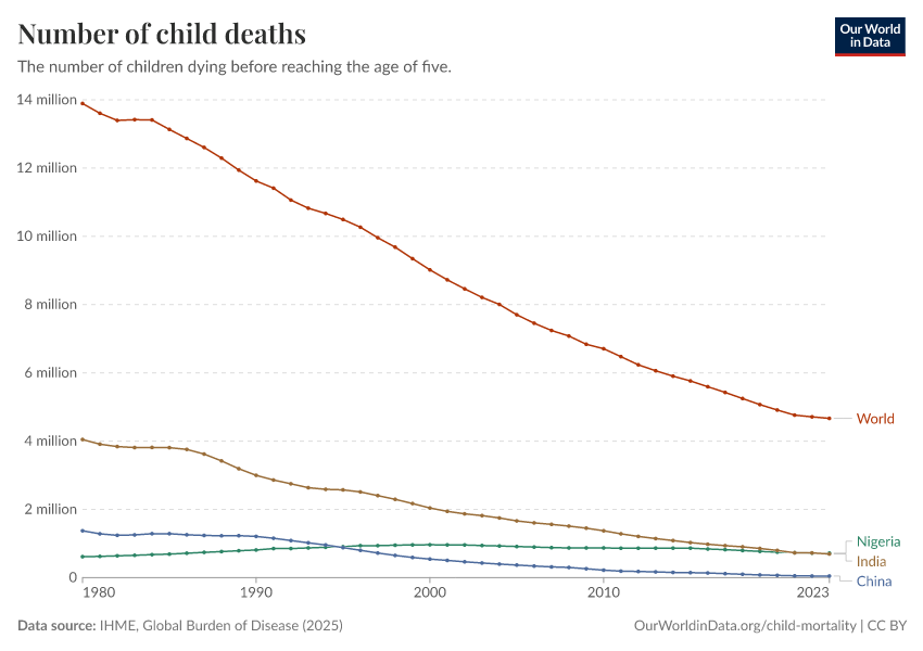 IHME, Global Burden of Disease (2024) – with minor processing by Our World in Data. “Number of child deaths” [dataset]. IHME, Global Burden of Disease, “Global Burden of Disease - Deaths and DALYs” [original data]. Retrieved January 8, 2026 from https://multi-dim-redirects-index.owid.pages.dev/grapher/number-of-child-deaths