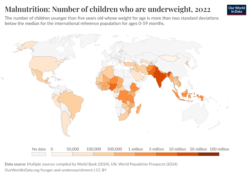“Data Page: Number of underweight children”. Our World in Data (2026). Data adapted from UNICEF, WHO, World Bank, United Nations. Retrieved from https://multi-dim-redirects-index.owid.pages.dev/grapher/number-of-children-who-are-underweight [online resource]How to cite this data