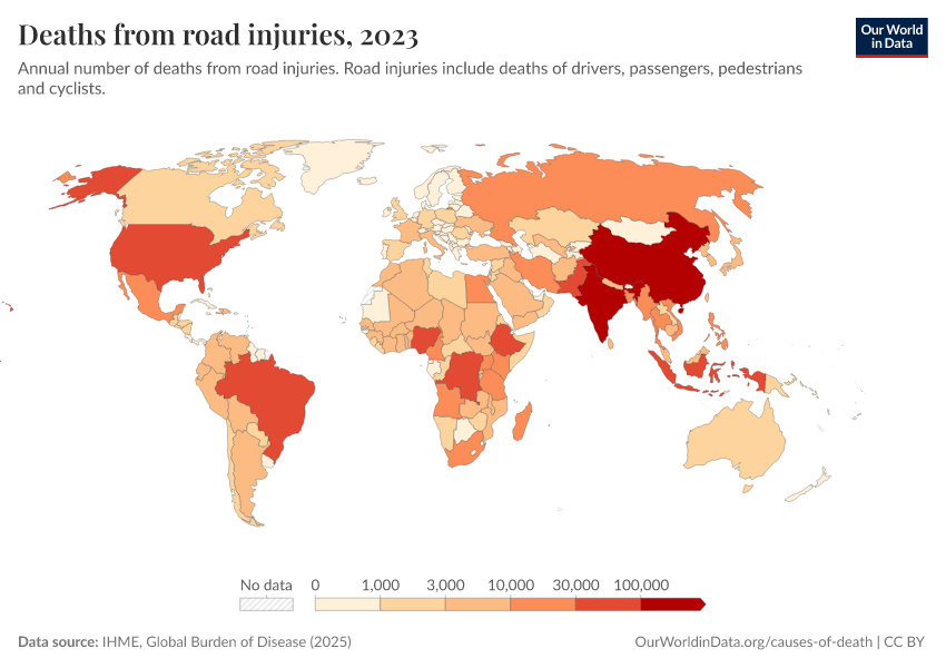 IHME, Global Burden of Disease (2024) – with minor processing by Our World in Data. “Deaths from road injuries” [dataset]. IHME, Global Burden of Disease, “Global Burden of Disease - Deaths and DALYs” [original data]. Retrieved January 8, 2026 from https://multi-dim-redirects-index.owid.pages.dev/grapher/number-of-deaths-from-road-injuries