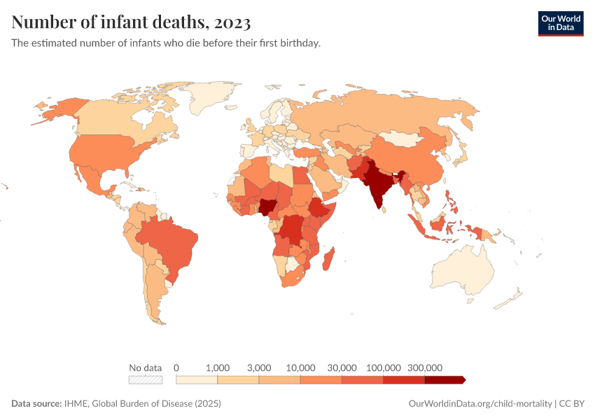 IHME, Global Burden of Disease (2024) – with minor processing by Our World in Data. “Number of infant deaths” [dataset]. IHME, Global Burden of Disease, “Global Burden of Disease - Child Mortality” [original data]. Retrieved January 8, 2026 from https://multi-dim-redirects-index.owid.pages.dev/grapher/number-of-infant-deaths-ihme