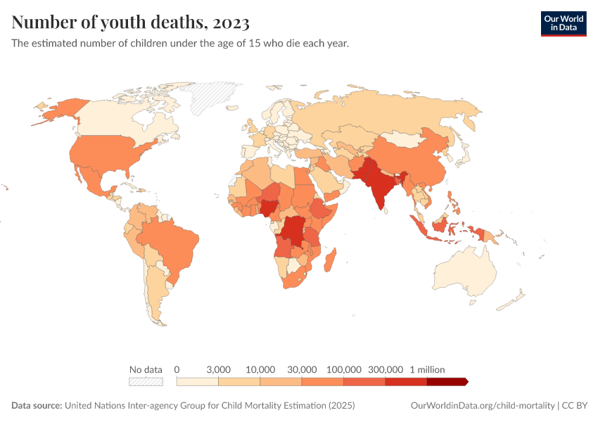 United Nations Inter-agency Group for Child Mortality Estimation (2025) – with major processing by Our World in Data. “Under-fifteen deaths” [dataset]. United Nations Inter-agency Group for Child Mortality Estimation, “United Nations Inter-agency Group for Child Mortality Estimation”; UN Inter-agency Group for Child Mortality Estimation, “Child Mortality Estimates 2018”; Various sources, “Population” [original data]. Retrieved January 8, 2026 from https://multi-dim-redirects-index.owid.pages.dev/grapher/number-of-youth-deaths