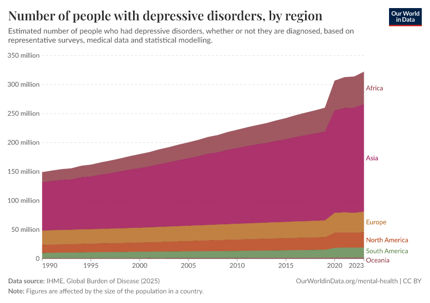 “Data Page: Number of people with depressive disorders, by region”, part of the following publication: Saloni Dattani, Lucas Rodés-Guirao, Hannah Ritchie, and Max Roser (2023) - “Mental Health”. Data adapted from IHME, Global Burden of Disease. Retrieved from https://multi-dim-redirects-index.owid.pages.dev/grapher/number-suffering-from-depression-by-region [online resource]How to cite this data