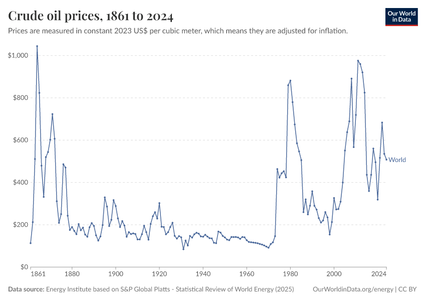“Data Page: Oil price - Crude prices since 1861”, part of the following publication: Hannah Ritchie, Pablo Rosado, and Max Roser (2023) - “Energy”. Data adapted from Energy Institute. Retrieved from https://multi-dim-redirects-index.owid.pages.dev/grapher/oil-prices-inflation-adjusted [online resource]How to cite this data