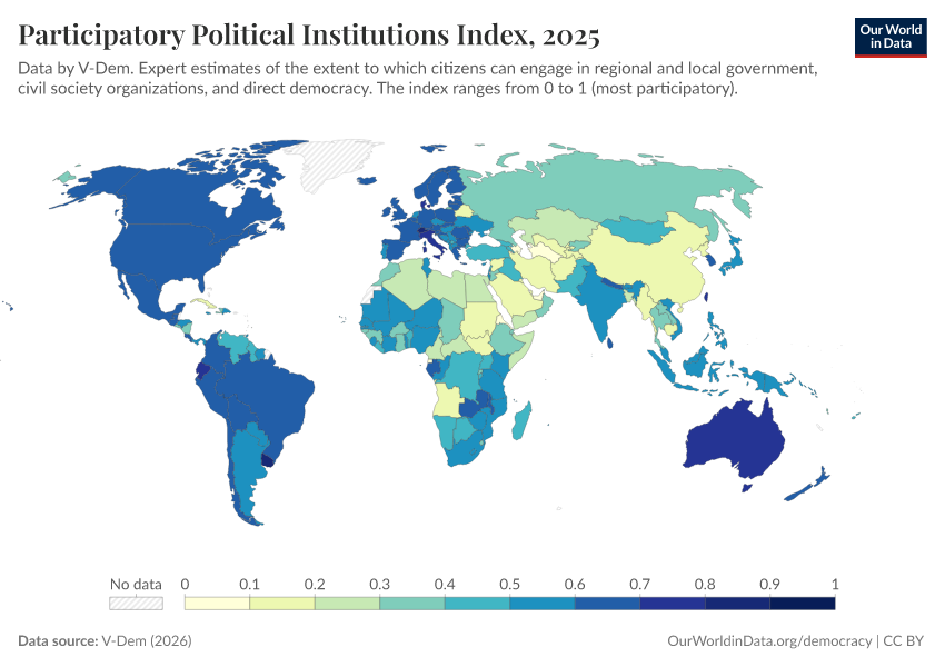 “Data Page: Participatory political institutions”, part of the following publication: Bastian Herre, Lucas Rodés-Guirao, and Esteban Ortiz-Ospina (2013) - “Democracy”. Data adapted from V-Dem. Retrieved from https://multi-dim-redirects-index.owid.pages.dev/grapher/participatory-political-institutions-index [online resource]How to cite this data
