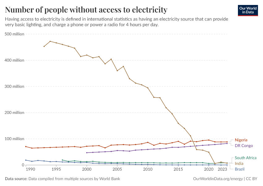 “Data Page: Number of people without access to electricity”, part of the following publication: Hannah Ritchie, Pablo Rosado, and Max Roser (2019) - “Access to Energy”. Data adapted from SDG 7.1.1 Electrification Dataset, World Bank, via World Bank, United Nations Population Division, national statistical offices, and Eurostat, via World Bank. Retrieved from https://multi-dim-redirects-index.owid.pages.dev/grapher/people-without-electricity-country [online resource]How to cite this data
