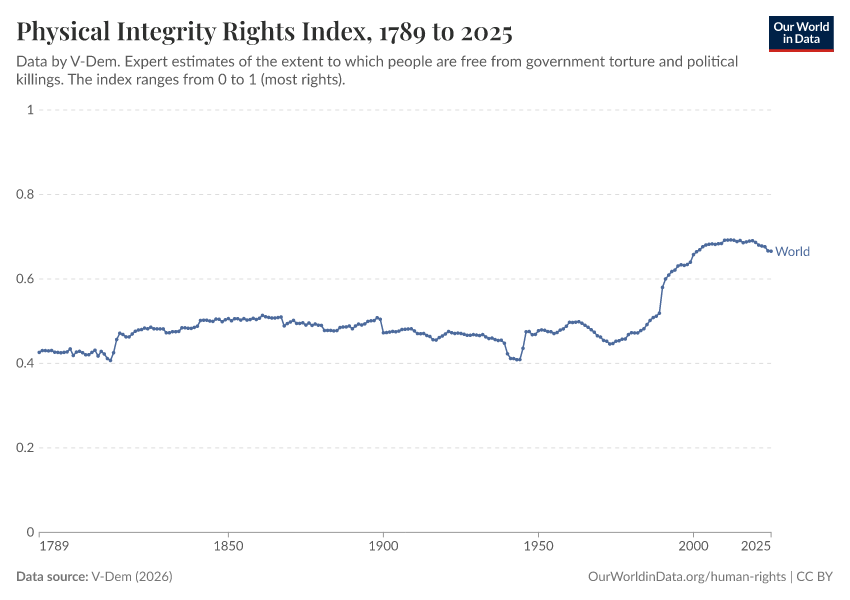 V-Dem (2025) – processed by Our World in Data. “Physical violence index – V-Dem” [dataset]. V-Dem, “Democracy report v15” [original data]. Retrieved January 8, 2026 from https://multi-dim-redirects-index.owid.pages.dev/grapher/physical-integrity-rights-index-vdem