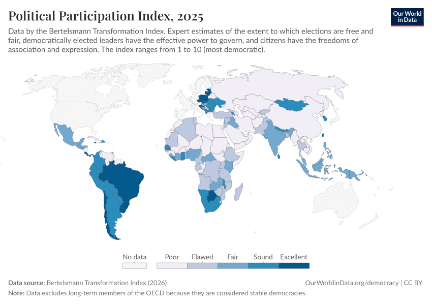 Bertelsmann Transformation Index (2024) – processed by Our World in Data. “Political Participation Index” [dataset]. Bertelsmann Transformation Index, “Bertelsmann Transformation Index, Scores” [original data]. Retrieved January 8, 2026 from https://multi-dim-redirects-index.owid.pages.dev/grapher/political-participation-index-bti