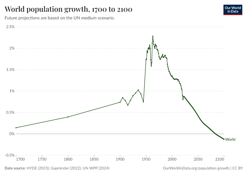 “Data Page: World population growth”, part of the following publication: Hannah Ritchie, Lucas Rodés-Guirao, Edouard Mathieu, Marcel Gerber, Esteban Ortiz-Ospina, Joe Hasell, and Max Roser (2023) - “Population Growth”. Data adapted from PBL Netherlands Environmental Assessment Agency, Gapminder, United Nations. Retrieved from https://multi-dim-redirects-index.owid.pages.dev/grapher/population-growth-rate [online resource]How to cite this data