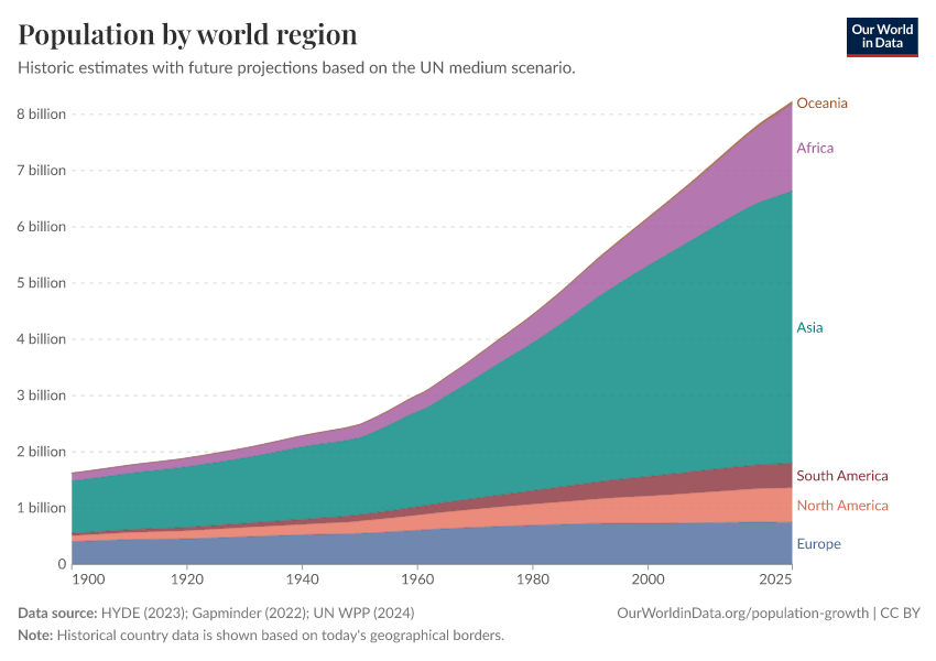 HYDE (2023); Gapminder (2022); UN WPP (2024) – with major processing by Our World in Data. “Population by world region” [dataset]. PBL Netherlands Environmental Assessment Agency, “History Database of the Global Environment 3.3”; Gapminder, “Population v7”; United Nations, “World Population Prospects”; Gapminder, “Systema Globalis” [original data]. Retrieved January 8, 2026 from https://multi-dim-redirects-index.owid.pages.dev/grapher/population-regions-with-projections