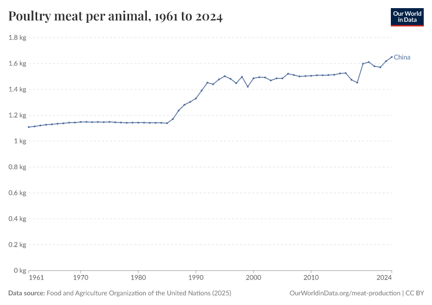 Food and Agriculture Organization of the United Nations (2025) – with major processing by Our World in Data. “Poultry meat yield per animal – UN FAO” [dataset]. Food and Agriculture Organization of the United Nations, “Production: Crops and livestock products” [original data]. Retrieved January 8, 2026 from https://multi-dim-redirects-index.owid.pages.dev/grapher/poultry-yields-meat-per-animal