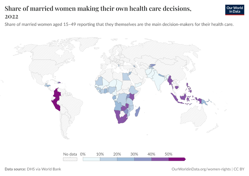 DHS via World Bank – processed by Our World in Data. “Share of married women making their own health care decisions” [dataset]. World Bank Gender Statistics, “World Bank Gender Statistics” [original data]. Retrieved January 8, 2026 from https://multi-dim-redirects-index.owid.pages.dev/grapher/proportion-of-women-who-make-their-own-informed-health-care-decisions