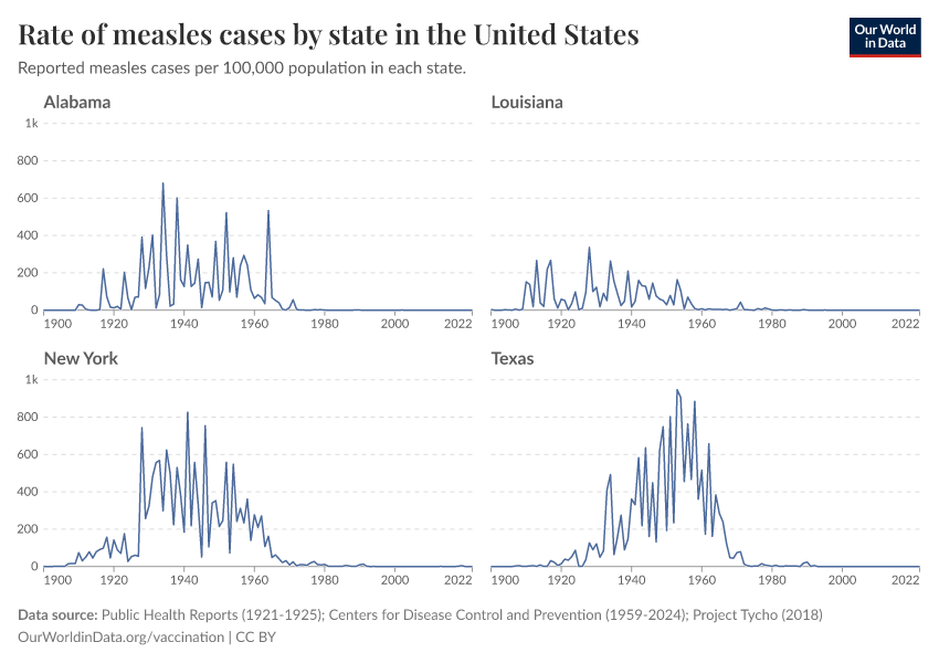 Public Health Reports (1921-1925); Centers for Disease Control and Prevention (1959-2024); Project Tycho (2018) – with major processing by Our World in Data. “Rate of measles cases by state in the United States” [dataset]. Project Tycho, “Project Tycho - Measles cases”; Centers for Disease Prevention and Control, “CDC Summary of Notifiable Infectious Diseases - Measles”; Centers for Disease Control and Prevention, “Reported measles cases - CDC”; Centers for Disease Control and Prevention, “National Notifiable Diseases Surveillance System - Measles”; U.S. Census Bureau, “Annual Estimates of the Population for each of the States in the USA” [original data]. Retrieved January 8, 2026 from https://multi-dim-redirects-index.owid.pages.dev/grapher/reported-measles-case-rate-by-state-in-the-united-states
