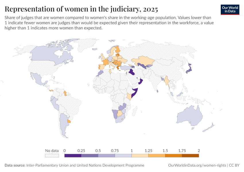 “Data Page: Representation of women in the judiciary”. Our World in Data (2026). Data adapted from Inter-Parliamentary Union and United Nations Development Programme. Retrieved from https://multi-dim-redirects-index.owid.pages.dev/grapher/representation-of-women-in-the-judiciary [online resource]How to cite this data