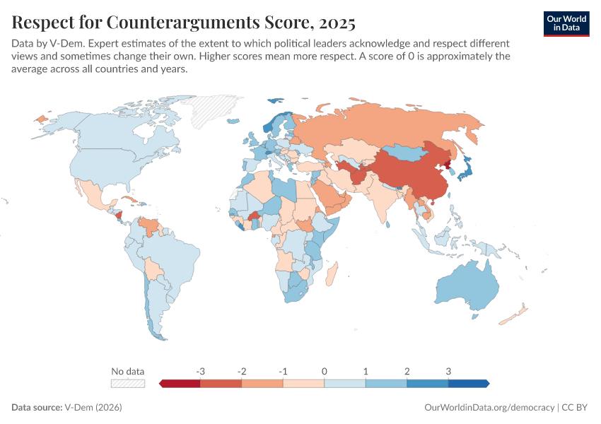 “Data Page: Respect for counterarguments”, part of the following publication: Bastian Herre, Lucas Rodés-Guirao, and Esteban Ortiz-Ospina (2013) - “Democracy”. Data adapted from V-Dem. Retrieved from https://multi-dim-redirects-index.owid.pages.dev/grapher/respect-for-counterarguments-score [online resource]How to cite this data