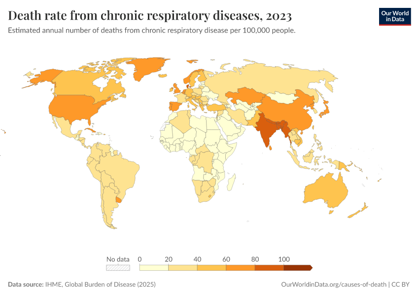 IHME, Global Burden of Disease (2024) – with minor processing by Our World in Data. “Death rate from chronic respiratory diseases” [dataset]. IHME, Global Burden of Disease, “Global Burden of Disease - Deaths and DALYs” [original data]. Retrieved January 8, 2026 from https://multi-dim-redirects-index.owid.pages.dev/grapher/respiratory-disease-death-rate-gbd