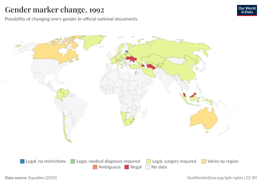 “Data Page: Gender marker change”, part of the following publication: Bastian Herre and Pablo Arriagada (2023) - “LGBT+ Rights”. Data adapted from Equaldex. Retrieved from https://multi-dim-redirects-index.owid.pages.dev/grapher/right-to-change-legal-gender-equaldex [online resource]