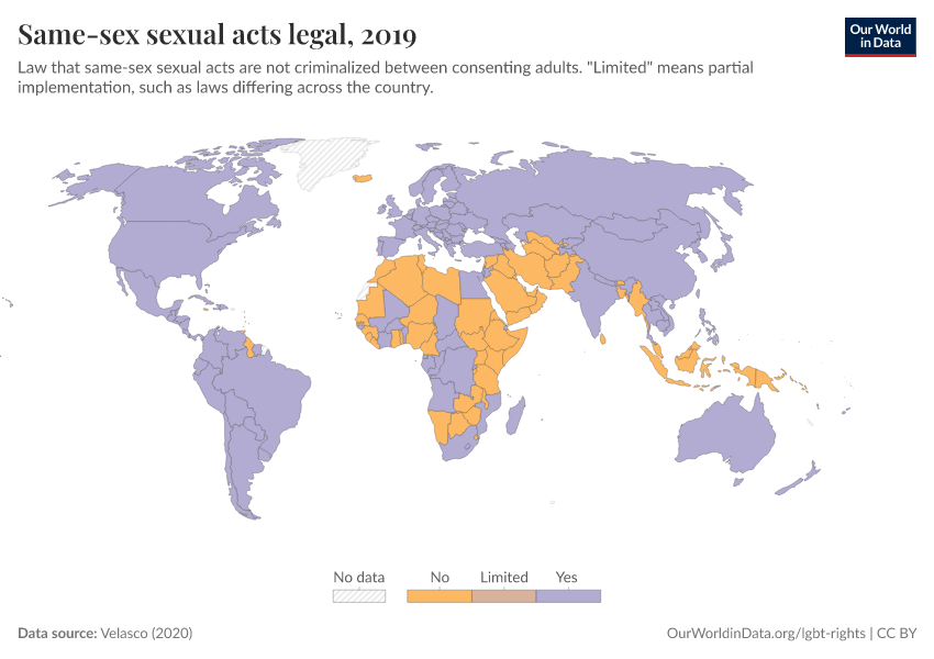 “Data Page: Same-sex sexual acts legal”, part of the following publication: Bastian Herre and Pablo Arriagada (2023) - “LGBT+ Rights”. Data adapted from Velasco. Retrieved from https://multi-dim-redirects-index.owid.pages.dev/grapher/same-sex-sexual-acts-legal [online resource]How to cite this data