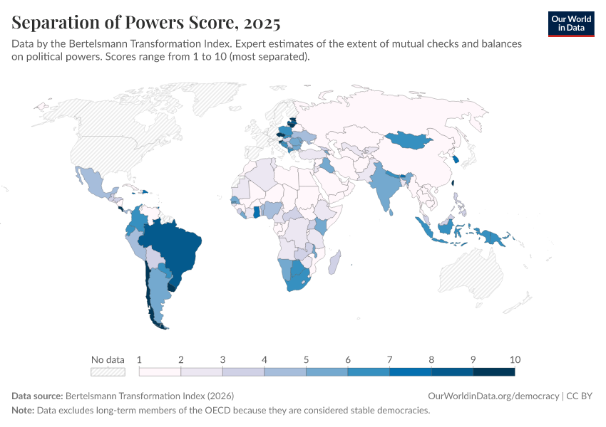 Bertelsmann Transformation Index (2024) – processed by Our World in Data. “Separation of powers score” [dataset]. Bertelsmann Transformation Index, “Bertelsmann Transformation Index, Scores” [original data]. Retrieved January 8, 2026 from https://multi-dim-redirects-index.owid.pages.dev/grapher/separation-of-powers-score-bti