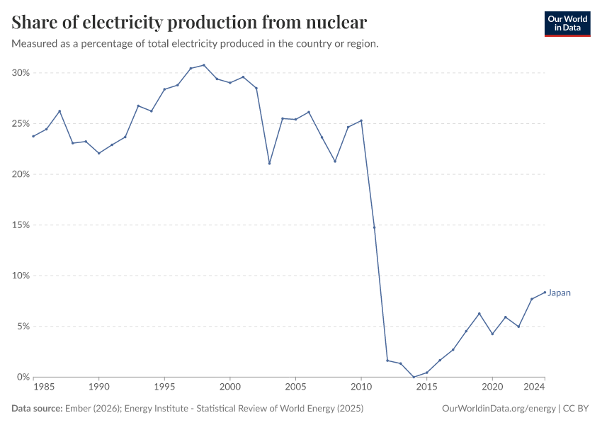 Ember (2025); Energy Institute - Statistical Review of World Energy (2025) – with major processing by Our World in Data. “Share of electricity generated by nuclear power” [dataset]. Ember, “Yearly Electricity Data Europe”; Ember, “Yearly Electricity Data”; Energy Institute, “Statistical Review of World Energy” [original data]. Retrieved January 8, 2026 from https://multi-dim-redirects-index.owid.pages.dev/grapher/share-electricity-nuclear