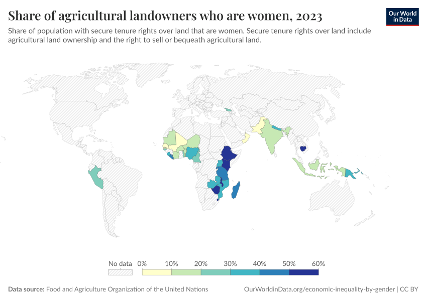“Data Page: Share of agricultural landowners who are women”. Our World in Data (2026). Data adapted from Food and Agriculture Organization of the United Nations. Retrieved from https://multi-dim-redirects-index.owid.pages.dev/grapher/share-of-agricultural-land-owners-that-are-women [online resource]How to cite this data