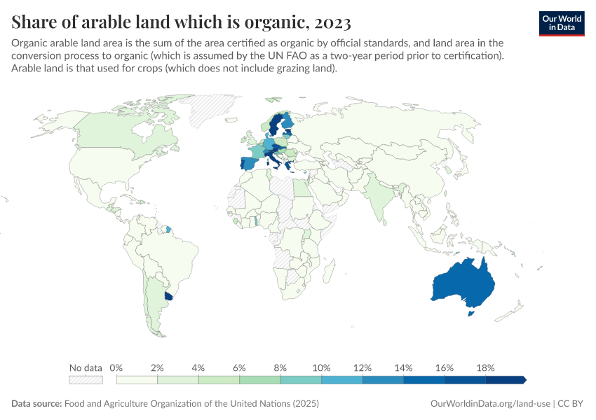 Food and Agriculture Organization of the United Nations (2024) – with major processing by Our World in Data. “Share of arable land that is organic – UN FAO” [dataset]. Food and Agriculture Organization of the United Nations, “Land, Inputs and Sustainability: Land Use” [original data]. Retrieved January 8, 2026 from https://multi-dim-redirects-index.owid.pages.dev/grapher/share-of-arable-land-which-is-organic