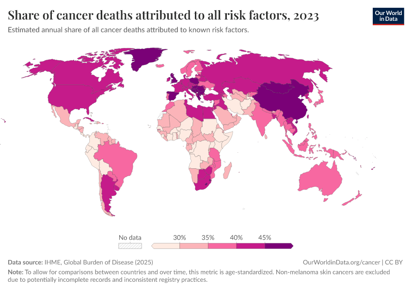 IHME, Global Burden of Disease (2024) – processed by Our World in Data. “Share of cancer deaths attributed to all risk factors” [dataset]. IHME, Global Burden of Disease, “Global Burden of Disease - Risk Factors for Cancer Deaths” [original data]. Retrieved January 8, 2026 from https://multi-dim-redirects-index.owid.pages.dev/grapher/share-of-cancer-deaths-attributed-to-all-risk-factors