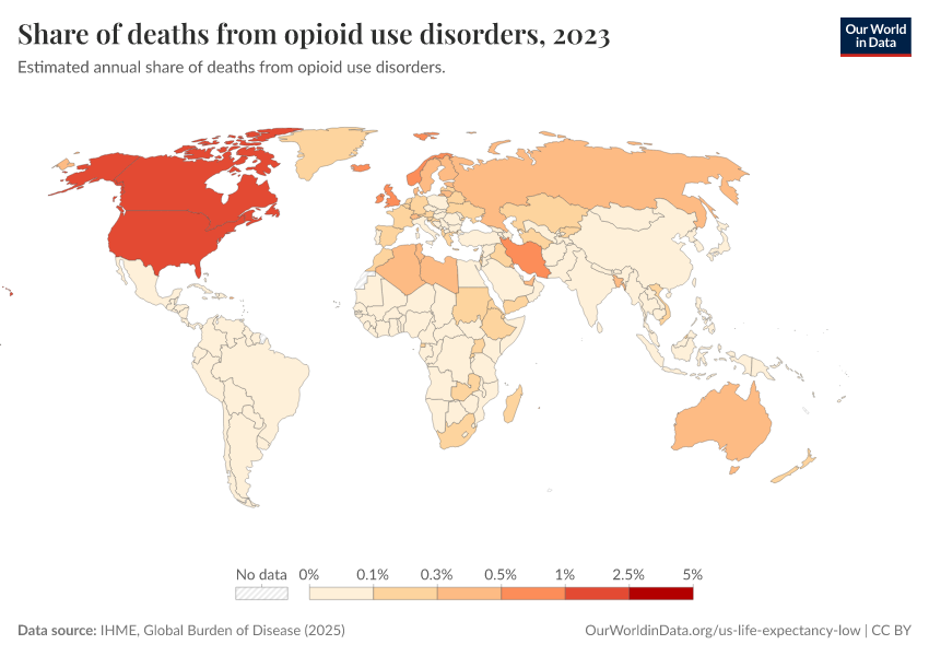 IHME, Global Burden of Disease (2024) – with minor processing by Our World in Data. “Share of deaths from opioid use disorders” [dataset]. IHME, Global Burden of Disease, “Global Burden of Disease - Deaths and DALYs” [original data]. Retrieved January 8, 2026 from https://multi-dim-redirects-index.owid.pages.dev/grapher/share-of-deaths-from-opioid-overdoses