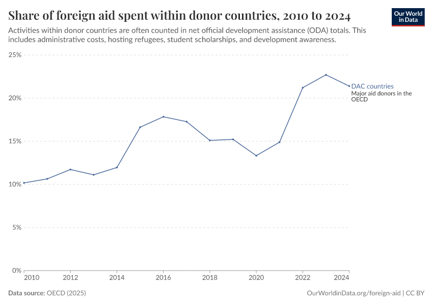 OECD (2025) – with minor processing by Our World in Data. “ODA by donor - In-donor aid (% of ODA) – Net disbursements” [dataset]. OECD, “OECD Official Development Assistance (ODA) - DAC1: Flows by provider (ODA+OOF+Private)” [original data]. Retrieved January 8, 2026 from https://multi-dim-redirects-index.owid.pages.dev/grapher/share-of-foreign-aid-spent-within-donor-countries