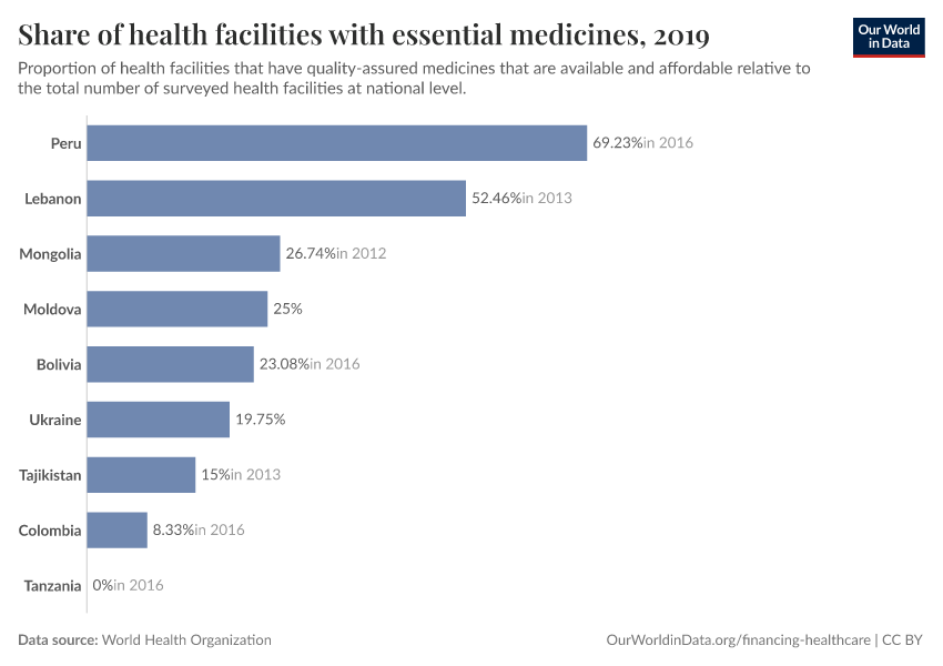 World Health Organization – processed by Our World in Data. “Share of health facilities with essential medicines” [dataset]. World Health Organization, “HAI/WHO – Health Action International/ World Health Organization (joint project for data collection and analysis), MedMon Pilot – Pilot WHO Essential Medicines and Health Products Price and Availability Monitoring Mobile Application” [original data]. Retrieved January 8, 2026 from https://multi-dim-redirects-index.owid.pages.dev/grapher/share-of-health-facilities-with-essential-medicines